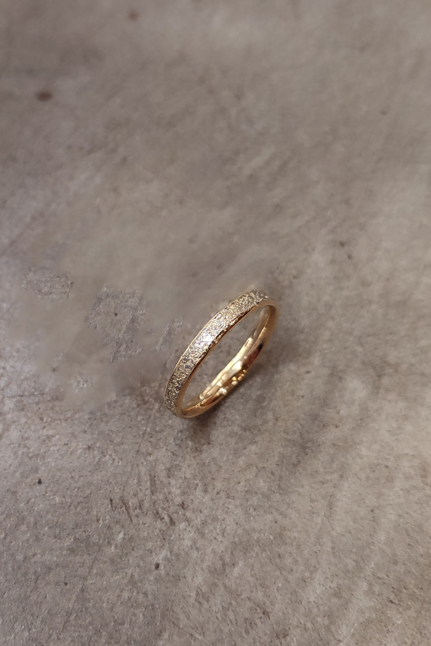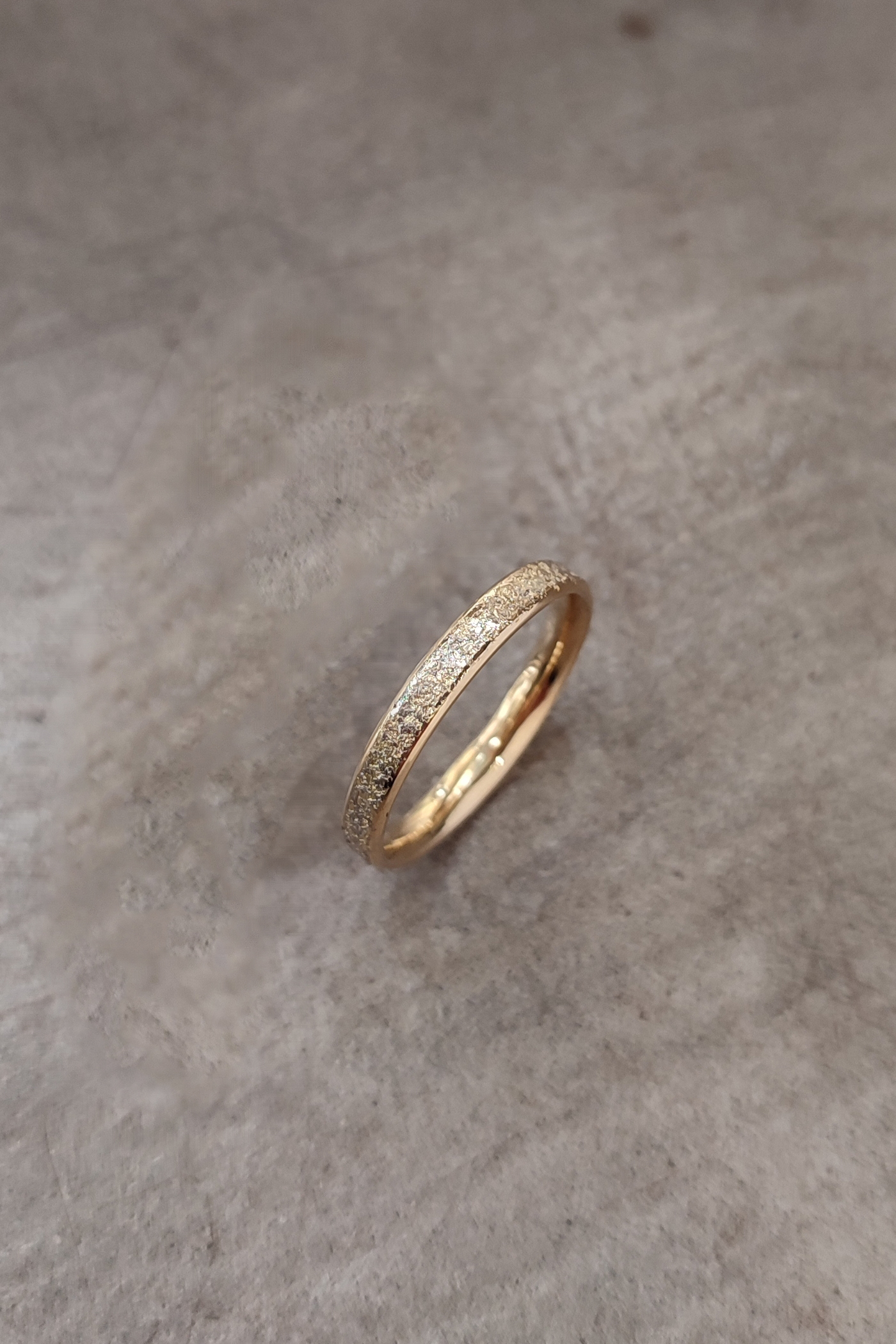 La poussière d’or gris palladié 750/°° (18k) est fusionnée sur de l’or jaune 750/°° (18k). La texture est obtenu par la flamme du chalumeau qui vient faire rougir l’argent et capter les poussières d’or déposer sur le métal.